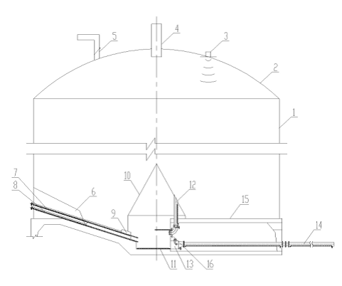 7—环形内区流化棒及卸料管;8—环形外区流化棒及卸料管; 9—料封管;10—封闭减压锥;11—中心区流化棒;12—垂直下料管;13—发送器;14—出料涌管;15—廊道;16—人孔及观察孔 。